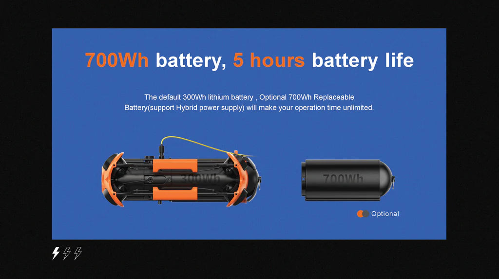 For extended missions, an optional 700Wh battery provides up to 5 hours of runtime, while the external AC power system allows for truly unlimited operational time without interruption.