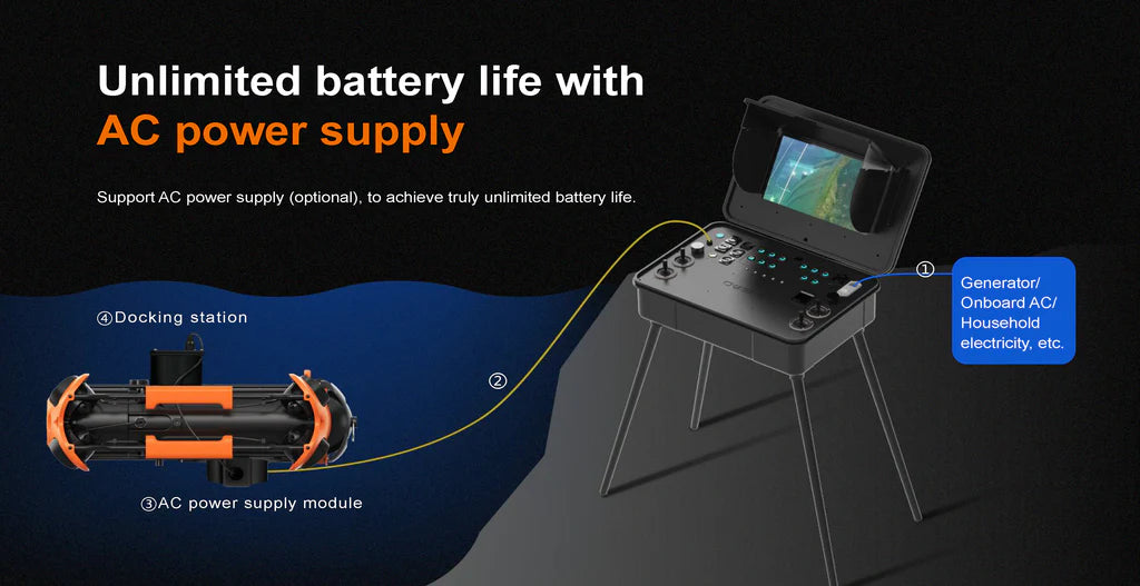 The CHASING M2 PRO supports both AC and DC power sources for continuous operation. It comes equipped with a standard 300Wh high-capacity lithium battery, which is removable and replaceable.